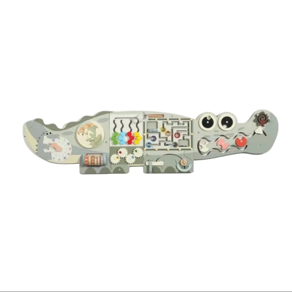 A large, interactive wall-mounted busy board designed in a fun crocodile shape, offering a wide range of fine-motor, sensory, and problem-solving activities. With gears, sliders, mazes, rotating wheels and bead tracks, it encourages hands-on exploration while supporting focus and coordination.