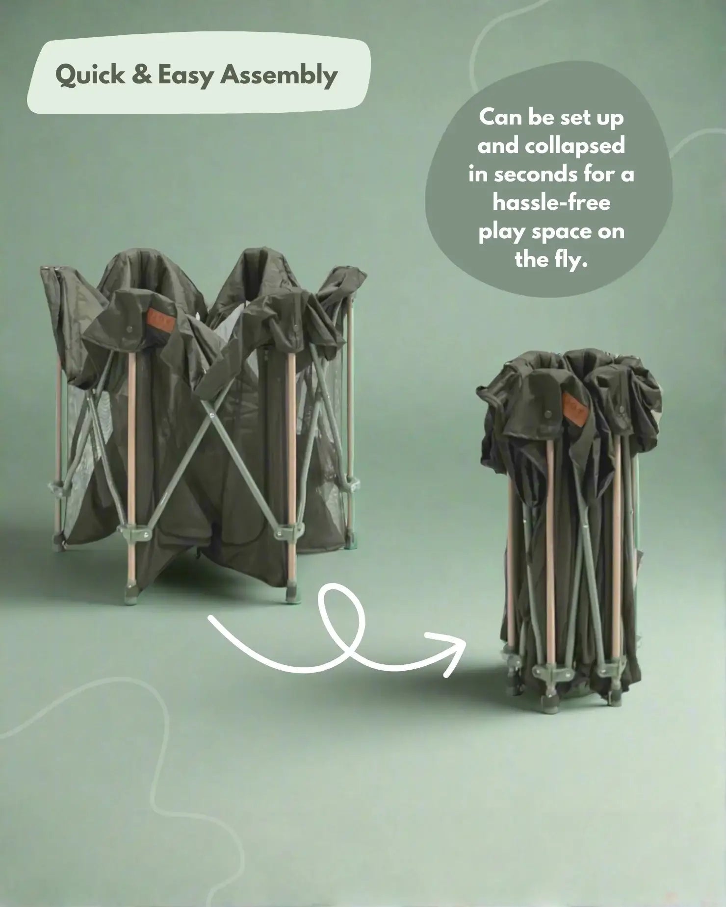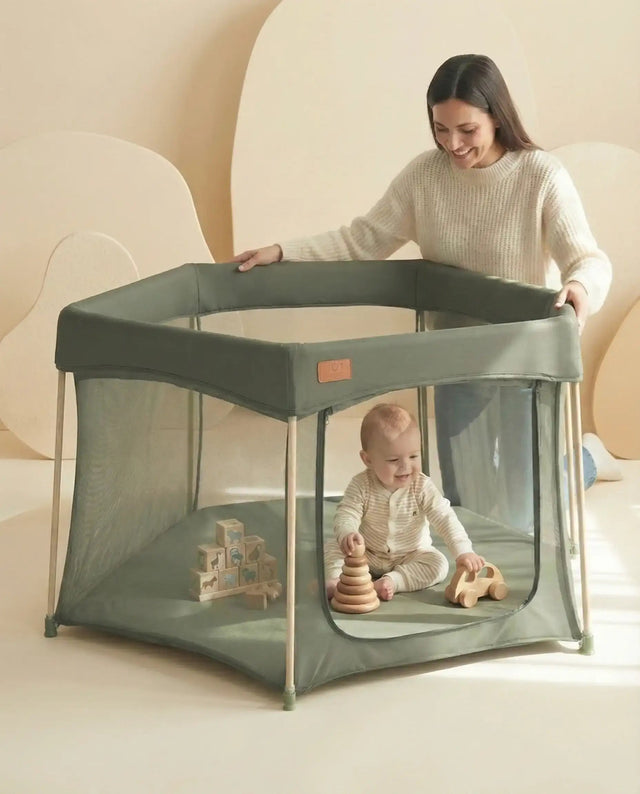- Stylish Design: Now in a stunning and bold green colourway with wooden accents this playpen fits perfectly into any rooms natural decor.